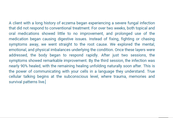 This is beyond standard coaching or even NLP. We go directly to the root, identifying and releasing the energetic imbalances , limiting beliefs and emotional patterns, allowing the body, mind, and spirit to harmonise.